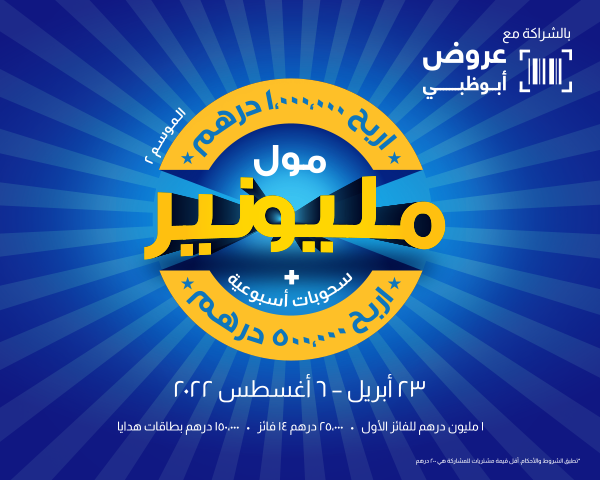 حملة "مليونير المول موسم 2" بالتعاون مع دائرة السياحة والثقافة في أبوظبي، حيث ستسلط الضوء على جزء من مهرجان أبوظبي للتسوق، ستقدم مراكزنا التسعة المشاركة في الحملة مجموعة من الجوائز والعروض الترفيهية والعديد من المفاجآت الأخرى وذلك من تاريخ 23 أبريل 2022 إلى 6 أغسطس 2022.